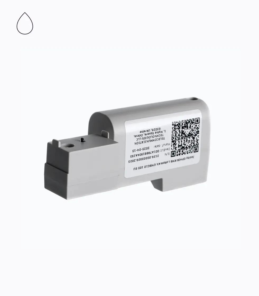 The device is powered by a built-in high-capacity battery that ensures 5 to 15 years of continuous operation.